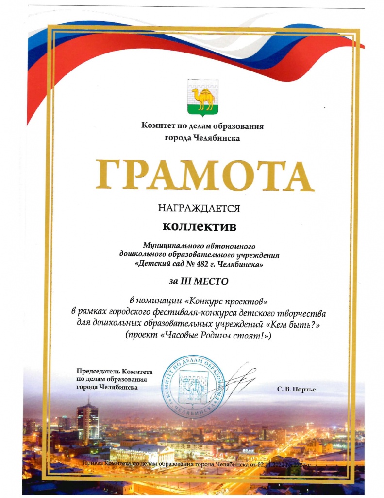 Подведены итоги городского фестиваля-конкурса детского творчества для дошкольных образовательных учреждений "Кем быть?", который проводиться с целью развития творческих способностей и познавательного интереса детей дошкольного возраста, популяризации инженерных и рабочих профессий. На основании результатов наш проект "Часовые Родины стоят!" занял III место в конкурсе проектов.