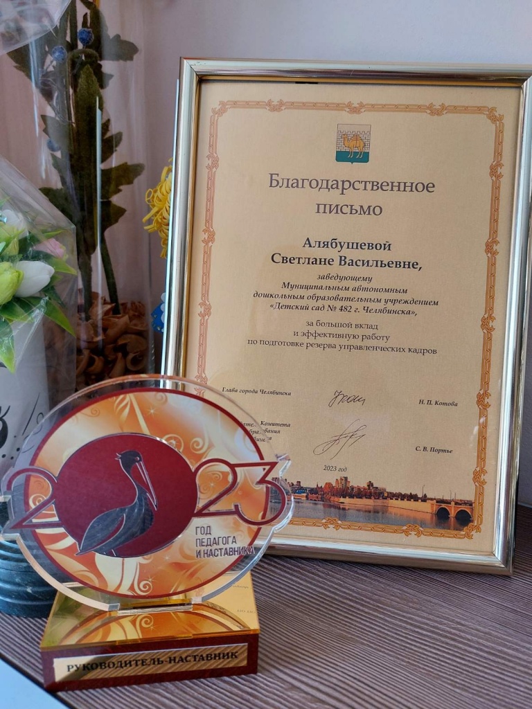 Мы рады поздравить с высокой наградой Светлану Васильевну Алябушеву Руководителя нашего образовательного учреждения. Председатель Комитета по делам образования Светлана Викторовна Портье  вручила благодарственное письмо и кубок Светлане Васильевне отметив многолетнюю работу по подготовке руководящих кадров дошкольных образовательных учреждений, как лучший "РУКОВОДИТЕЛЬ - НАСТАВНИК".