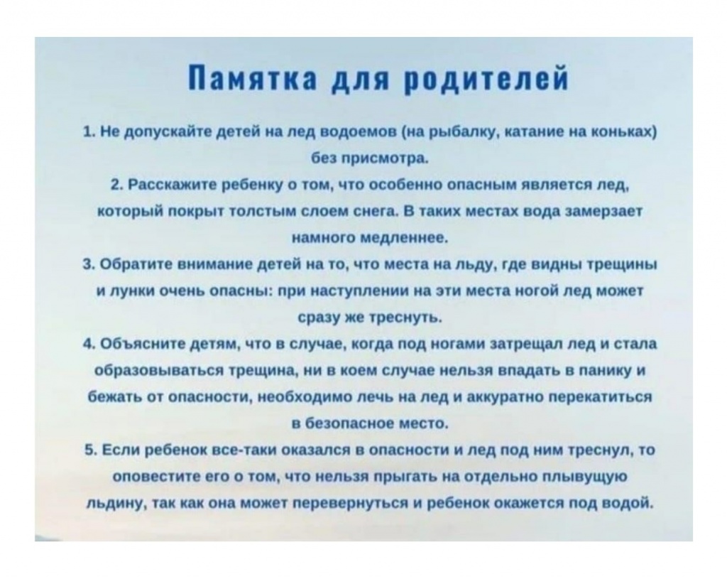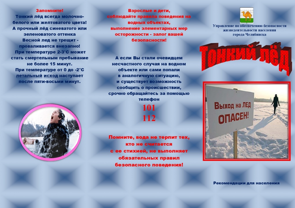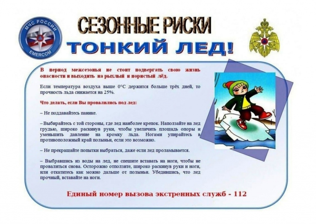Ежегодно тонкий лед становится причиной гибели людей, чаще всего среди погибших оказываются дети, которые гуляют вблизи водоемов без присмотра родителей (законных представителей). В целях обеспечения безопасности детей путем формирования знаний у несовершеннолетних и их родителей (законных представителей) о правилах поведения и соблюдения мер безопасности на водных объектах, а также предупреждения несчастных случаев на льду рекомендуем ознакомиться с буклетами и просмотреть видеоролик "Осторожно! Тонкий лед!"
