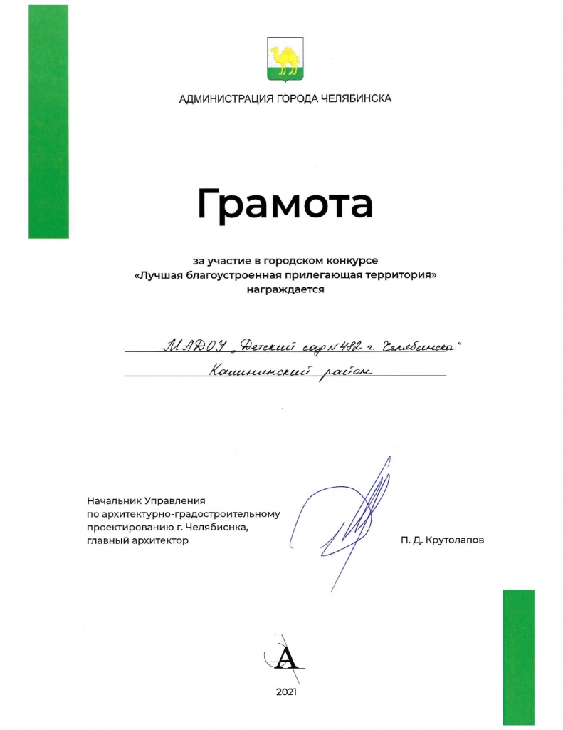 В администрации города Челябинска были подведены итоги конкурса "Лучшая благоустроенная прилегающая территория". В мероприятии приняли участие промышленные предприятия, школьные и дошкольные учреждения, торговые организации города. Награждение победителей грамотами и дипломами прошло в торжественной обстановке. Приятно получить диплом из рук главного архитектора города Павла Крутолапова.